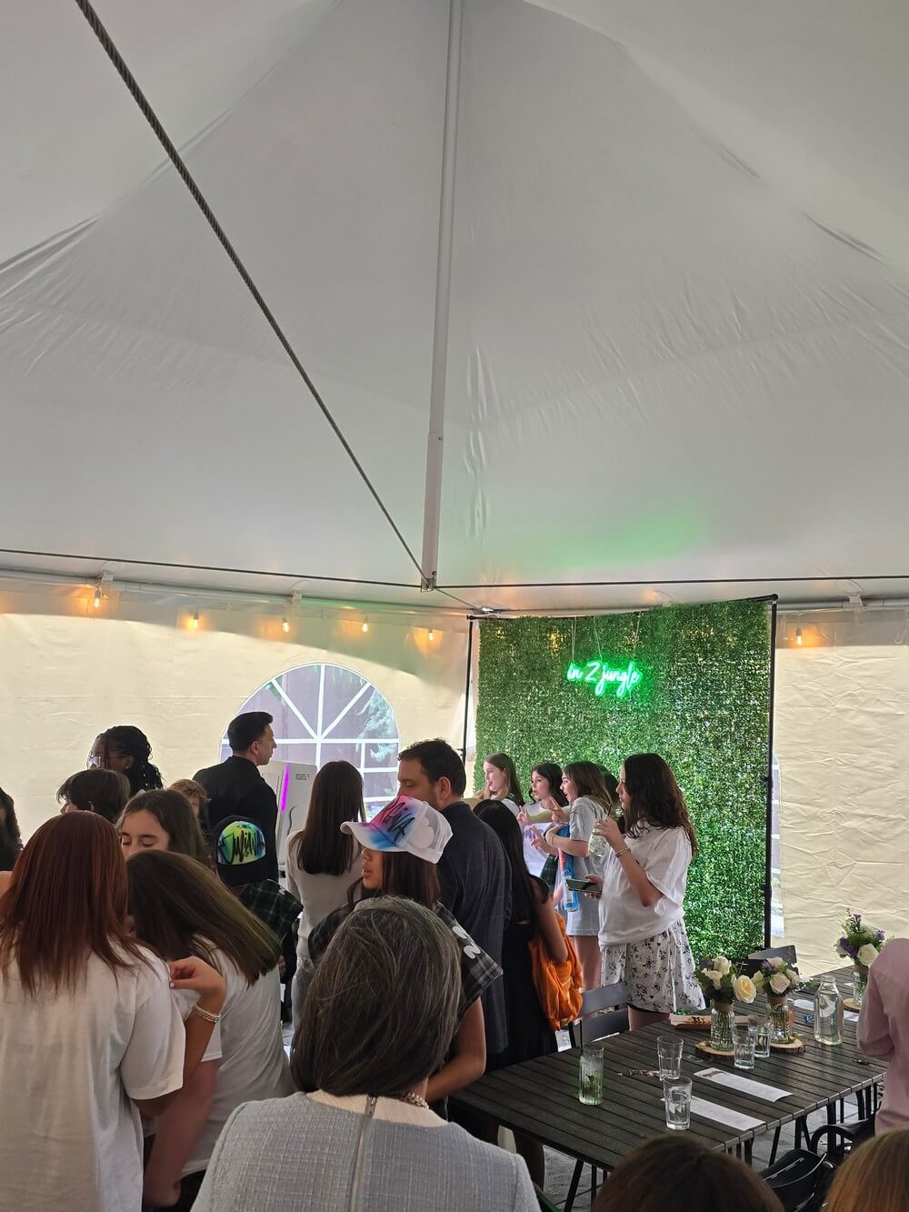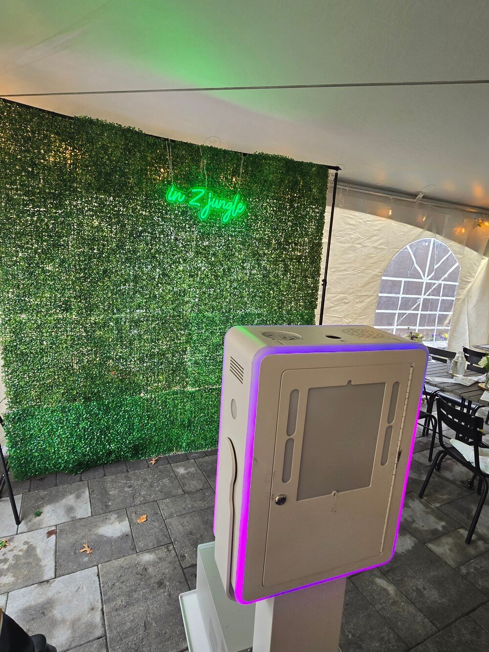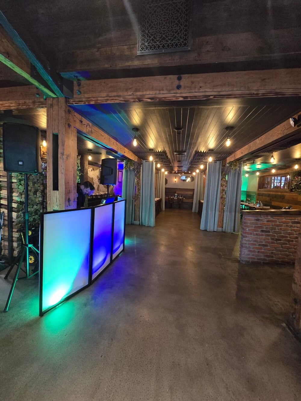 To set the stage, we rolled out our Silver DJ Package, featuring our signature uplighting glow booth that acted as the command center for the night. We completely transformed the room's vibe by deploying 24 units of wireless uplighting, washing the walls in colors that matched the event's theme. On the visual side, we installed two 55-inch TVs to display graphics and montages, and set up an 8-foot grass wall with a custom neon sign, creating a perfect, Instagram-worthy focal point for guests as they entered.